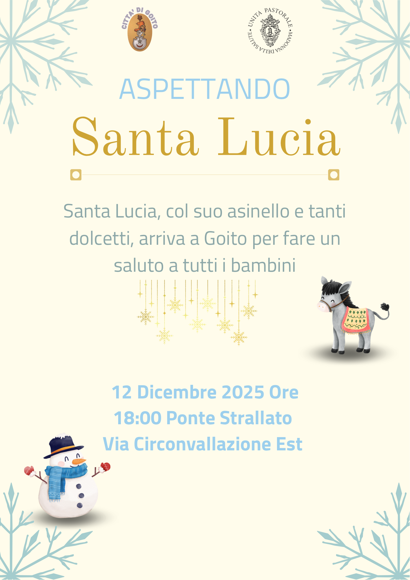 Venerdi 12 dicembre 2025 dalle ore 18,00, presso il ponte strallato di Goito, arriva Santa Lucia, con il suo asinello e con tanti dolcetti per fare un saluto a tutti i bambini.