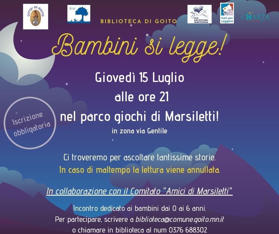 Giovedì prossimo, il 15 Luglio, aspettiamo tutti i bambini da 0 a 6 anni nel parco di Marsiletti alle ore 21.