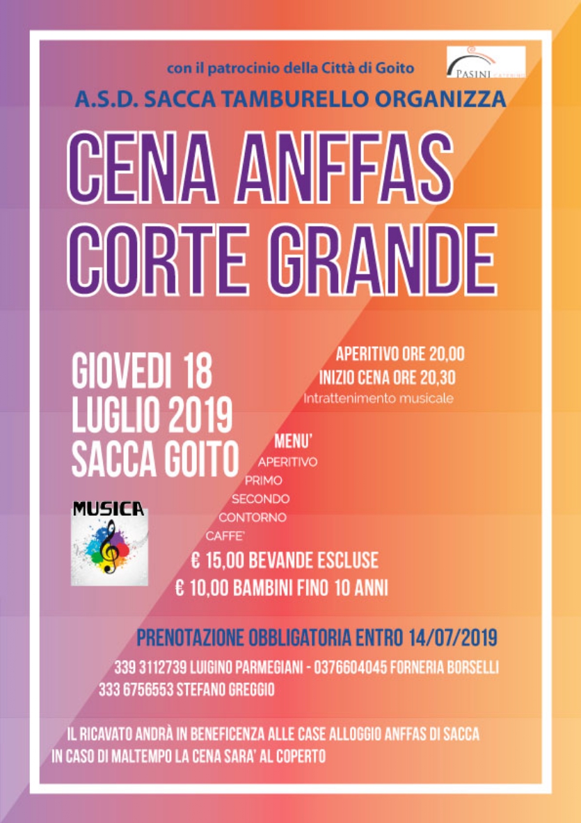 Giovedì 18 Luglio 2019 alle ore 20.00 presso la corte Grande di Sacca (Goito) si terrà la consueta cena a sostengo dell'associazione: il ricavato della cena andrà in beneficenza alle case alloggio ANFFAS di Sacca.