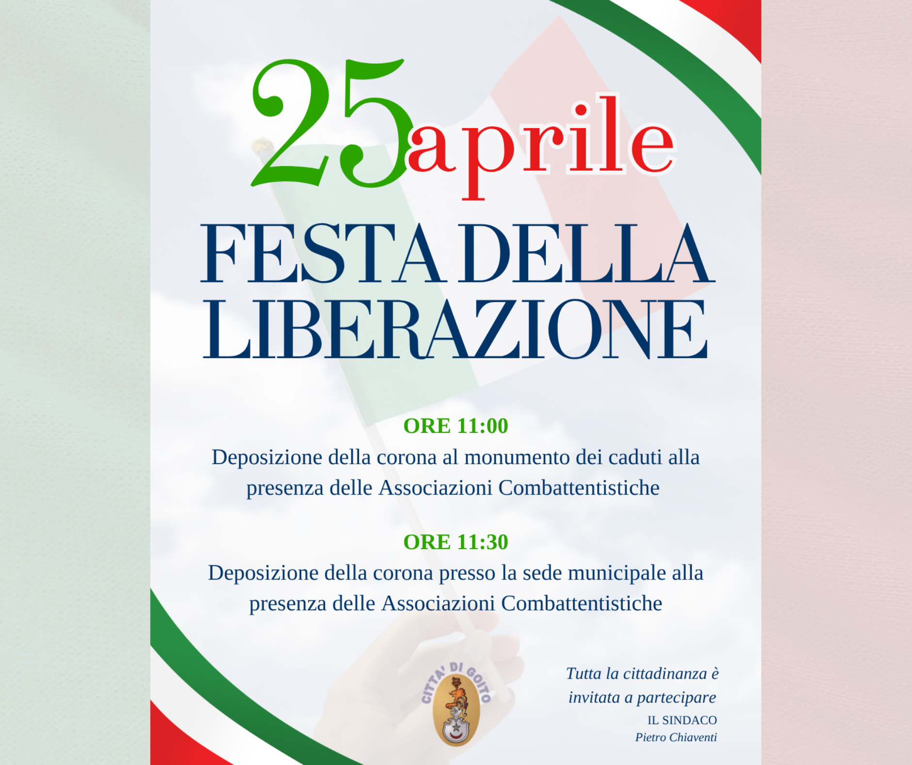 Saranno poste delle corone al Monumento dei Caduti e nella Sede Comunale.