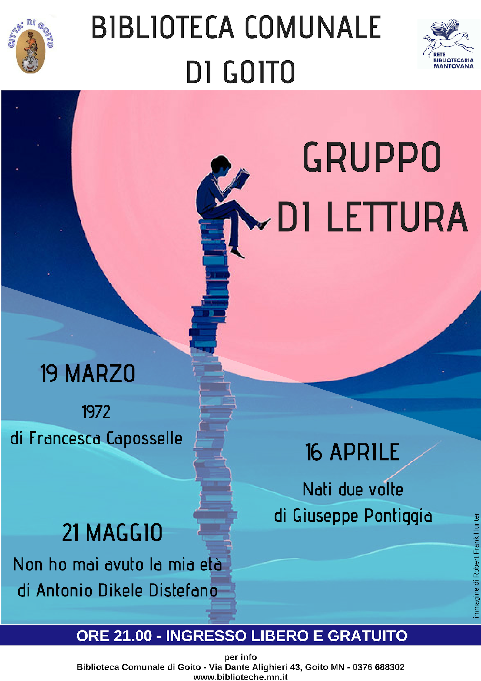 Il gruppo di lettura si ritroverà ancora nelle date 16 aprile (Nati due volte di Giuseppe Pontiggia) ed il 21 maggio (Non ho mai avuto la mia età di Antonio Dikele Distefano)