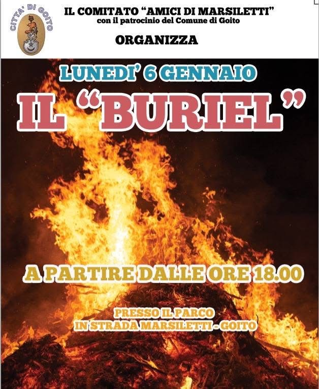 Lunedì 6 Gennaio 2025 si accende Il Buriel a Marsiletti di Goito, a partire dalle ore 18, organizzato dal Comitato "Amici di Marsiletti" con il patrocinio del Comune di Goito.
