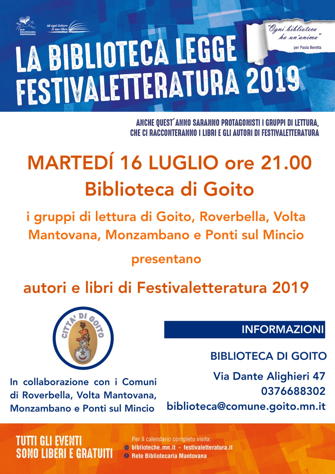 Martedì 16 luglio 2019 alle ore 21.00 presso la biblioteca di Goito i gruppi di lettura di Goito, Roverbella, Volta Mantovana, Monzambano e Ponti sul Mincio presentano autori e libri di Festivaletteratura 2019.