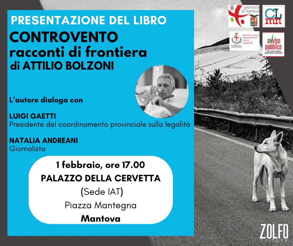 Giovedi 1 febbraio alle ore 17.00 presso Palazzo Cervetta a Mantova, si terrà la presentazione del nuovo libro del giornalista Attilio Bolzoni, uno dei più grandi giornalisti d'inchiesta in Italia, che dialogherà con Natalia Andreani - Giornalista, e Luigi Gaetti - Presidente del Coordinamento Provinciale sulla Legalità. “Controvento – Racconti di frontiera” è il titolo del libro che raccoglie il meglio dei suoi articoli scritti ad oggi sul tema della mafia. Un lungo viaggio in luoghi soprattutto della Sicilia e del Sud Italia ma anche di altre parti del mondo, dal Messico a Bagdad, dove l’autore si è trovato quasi per caso e non ha potuto fare altro che raccontare :" E' un viaggio che dura da quasi mezzo secolo. Da Palermo a Kabul, dalla polvere dei paesi siciliani alle paure di Bagdad, dalle mafie alle guerre. Poi i grandi misteri e i grandi delitti italiani. Fra le pagine di questo libro la Sicilia di Totò Riina e di Matteo Messina Denaro, l'inferno di Capaci, l'origine e le evoluzioni del marchio “Mafia” che ci ha resi ovunque famosi. Ma anche la Sicilia di Leonardo Sciascia, di Danilo Dolci, di Giovanni Falcone, di Letizia Battaglia. Anno dopo anno, di luogo in luogo, cronache controvento."