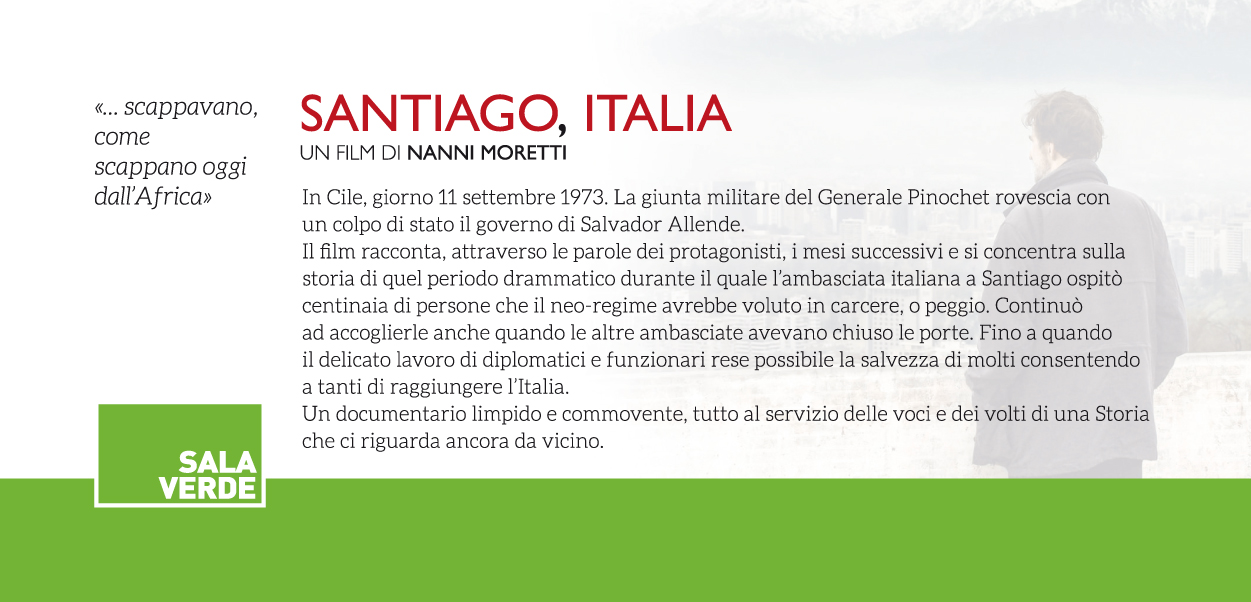 Per l'occasione verrà proiettato il film "Santiago, Italia" di Nanni Moretti: un documentario limpido e commovente, tutto al servizio delle voci e dei volti di una Storia che ci riguarda da vicino.